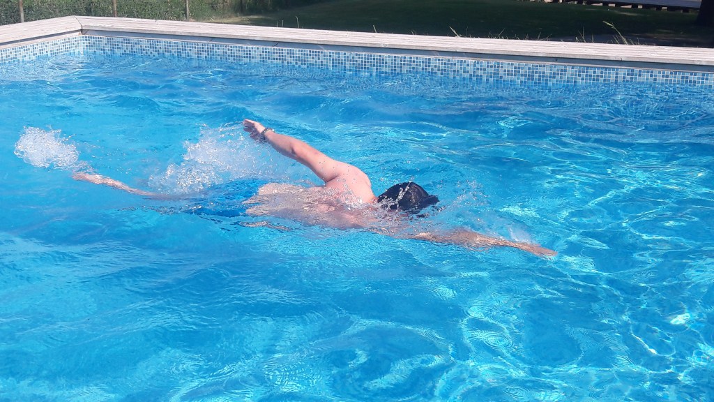 Serile le-am petrecut la piscină. Pescarului unde îi place mai mult în apă, eu pe margine, m-am delectat cu o carte și cu un pahar de vin în mână.