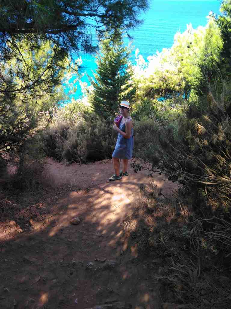 Eu m-am bucurat mult de acest drum prin pădure, urcă 20 minute până în vârful unui deal și de acolo priveliștea este O MI-NU-NĂ-ȚIE. Bucură-te de panorama de sus ca apoi să cobori pe mici dune de nisip. Grecii au fost ingenioși când au creat accesul pe această plajă și au avut de muncă la săpatul în stâncă.