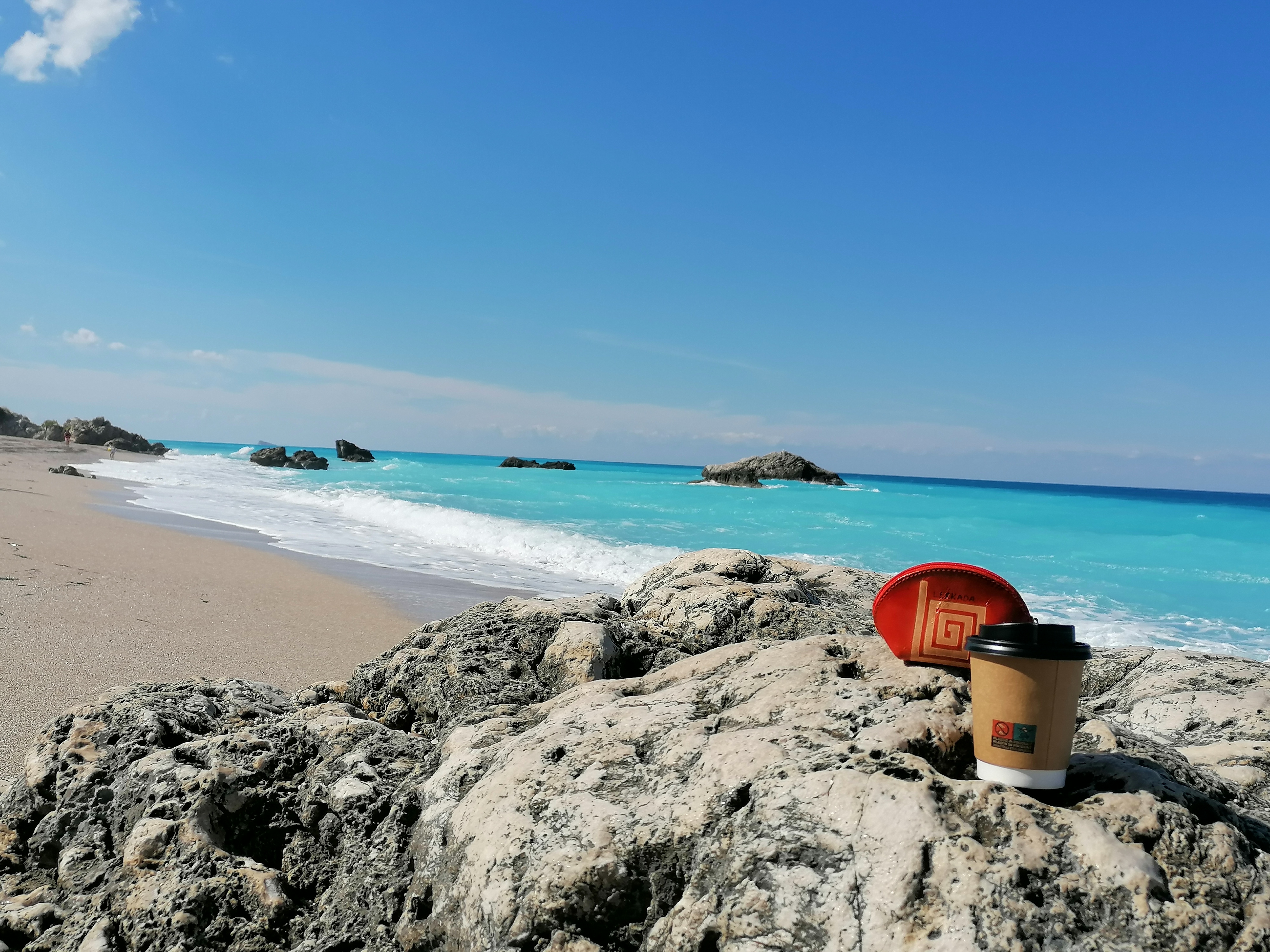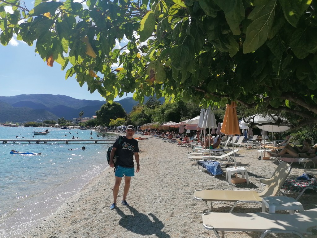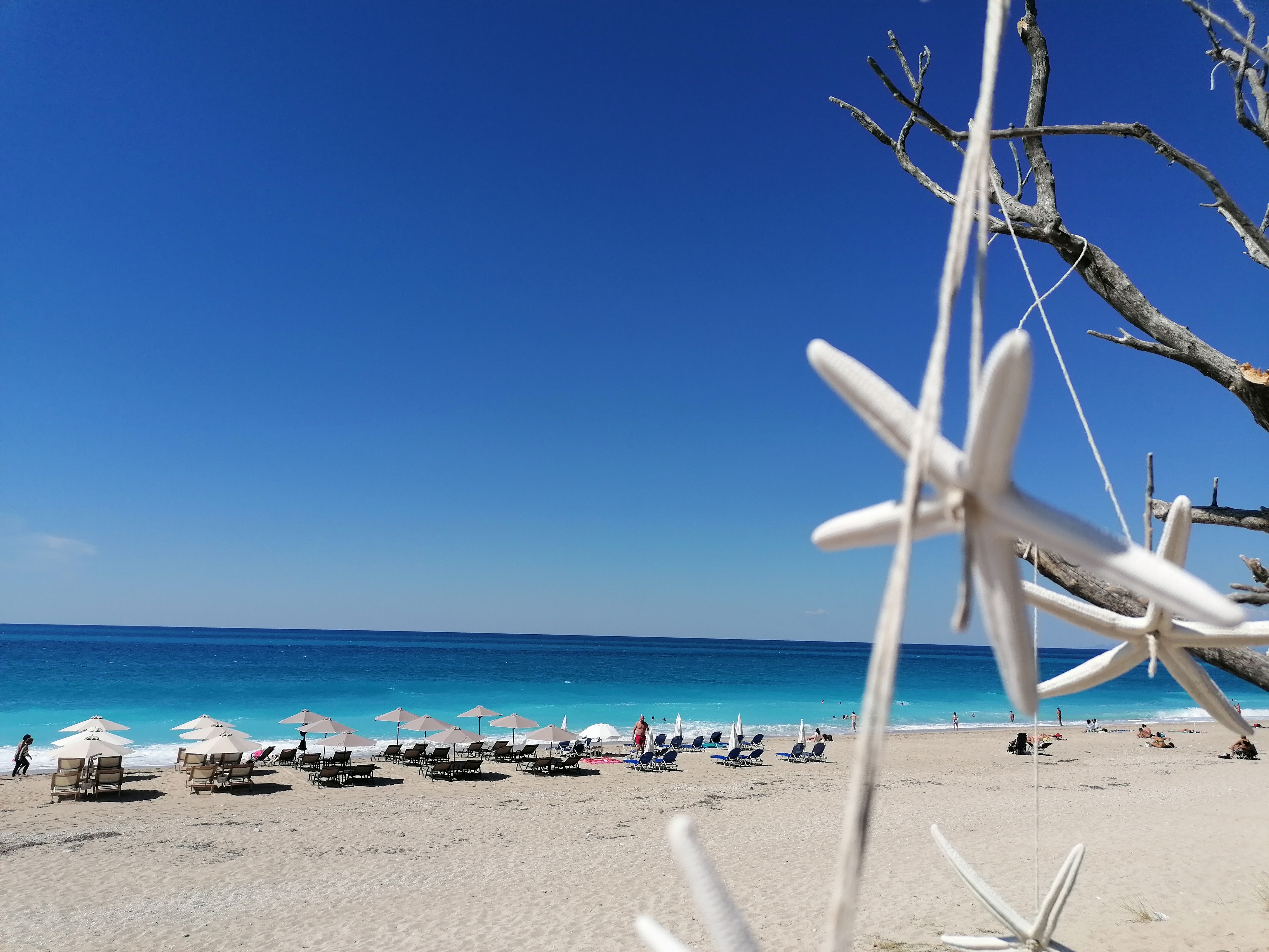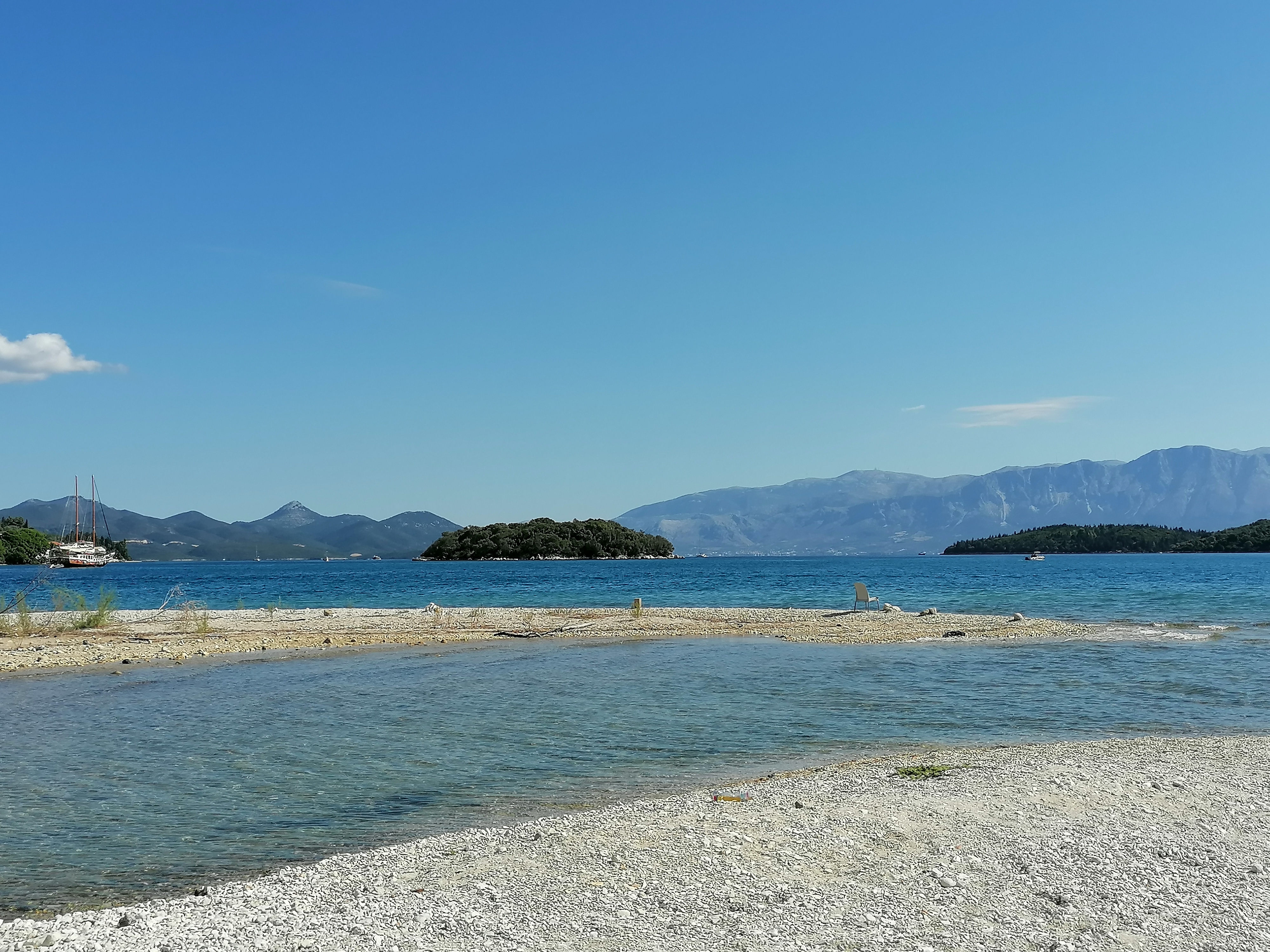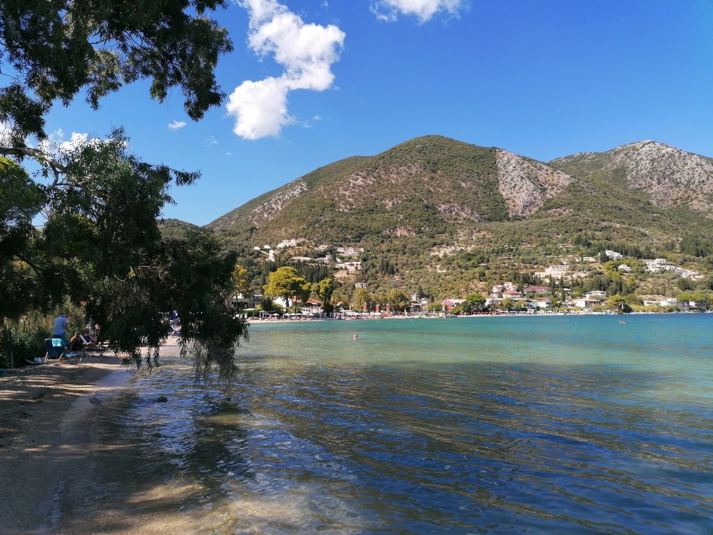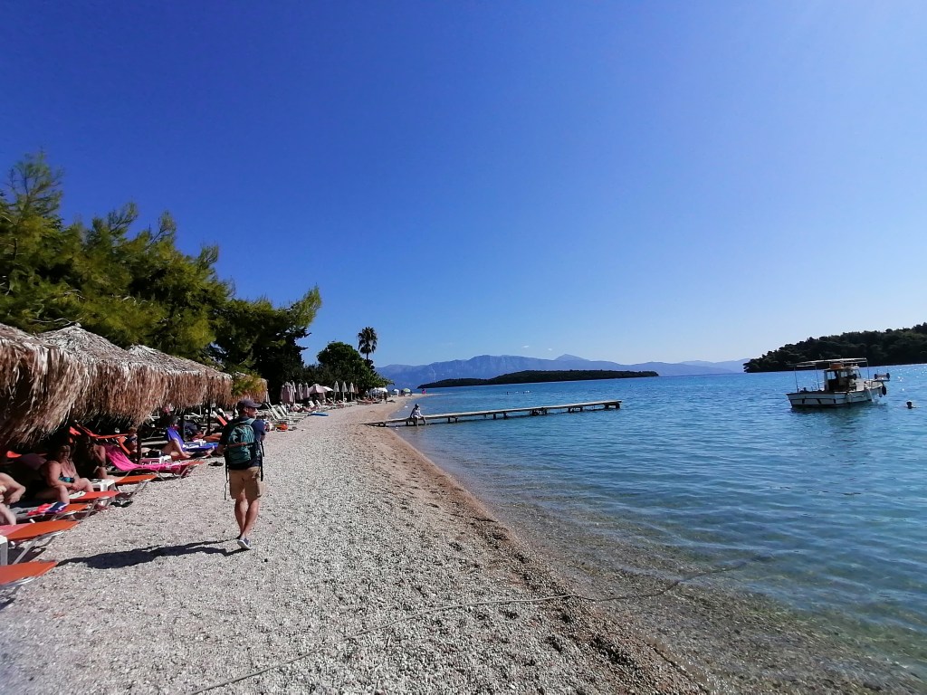Plaja este una cu pietre si nisip care are intrare lină în mare. Recomandăm cu tot dragul plaja de lângă Nidri Hotel Avra Beach. Zona are și o parte umbroasă cu copaci și găsești sezlonguri amplasate nu pe nisip ci pe… iarbă. Wow! Ne-am putut relaxa la soare sau la umbră, după preferințe, cu o carte în mână și cu o bere rece lângă.