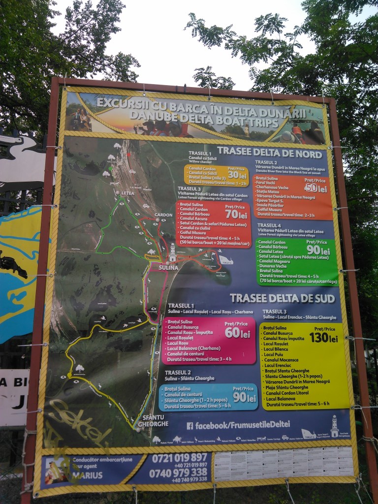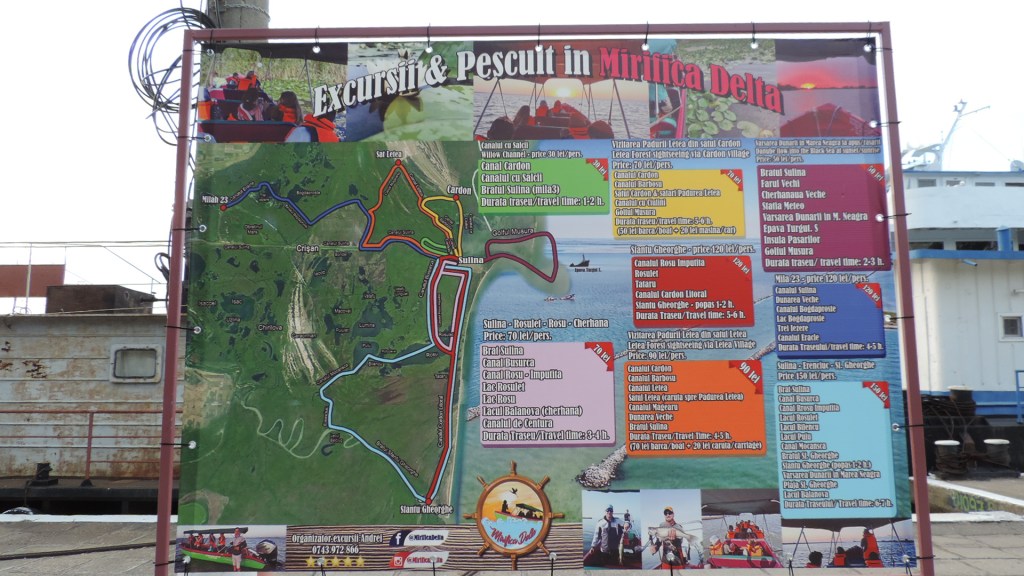 Să nu vă faceți probleme dacă nu știți cum să plecați în excursii cu barca. În Portul Sulina și pe toate gardurile, sunt foarte multe panouri publicitare cu trasee pe canale și datele de contact ale firmelor care organizează astfel de excursii. În funcție de durată și de destinație, prețurile variază între 50 – 100 lei.