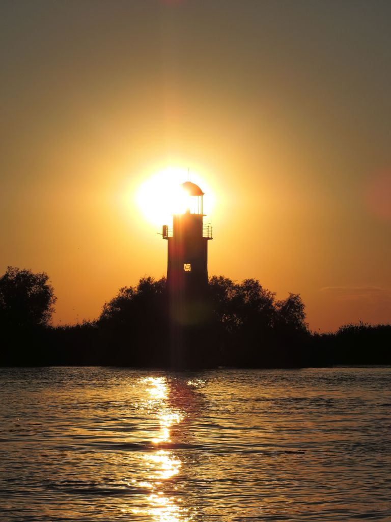 Dacă te interesează o plimbare cu barca, merită să petreci 20 de minute admirând apusul pe Dunăre, în Golful Musura. Ne-am întors în timp util ca să putem face poze la farul vechi chiar în momentul în care soarele se vedea prin far.