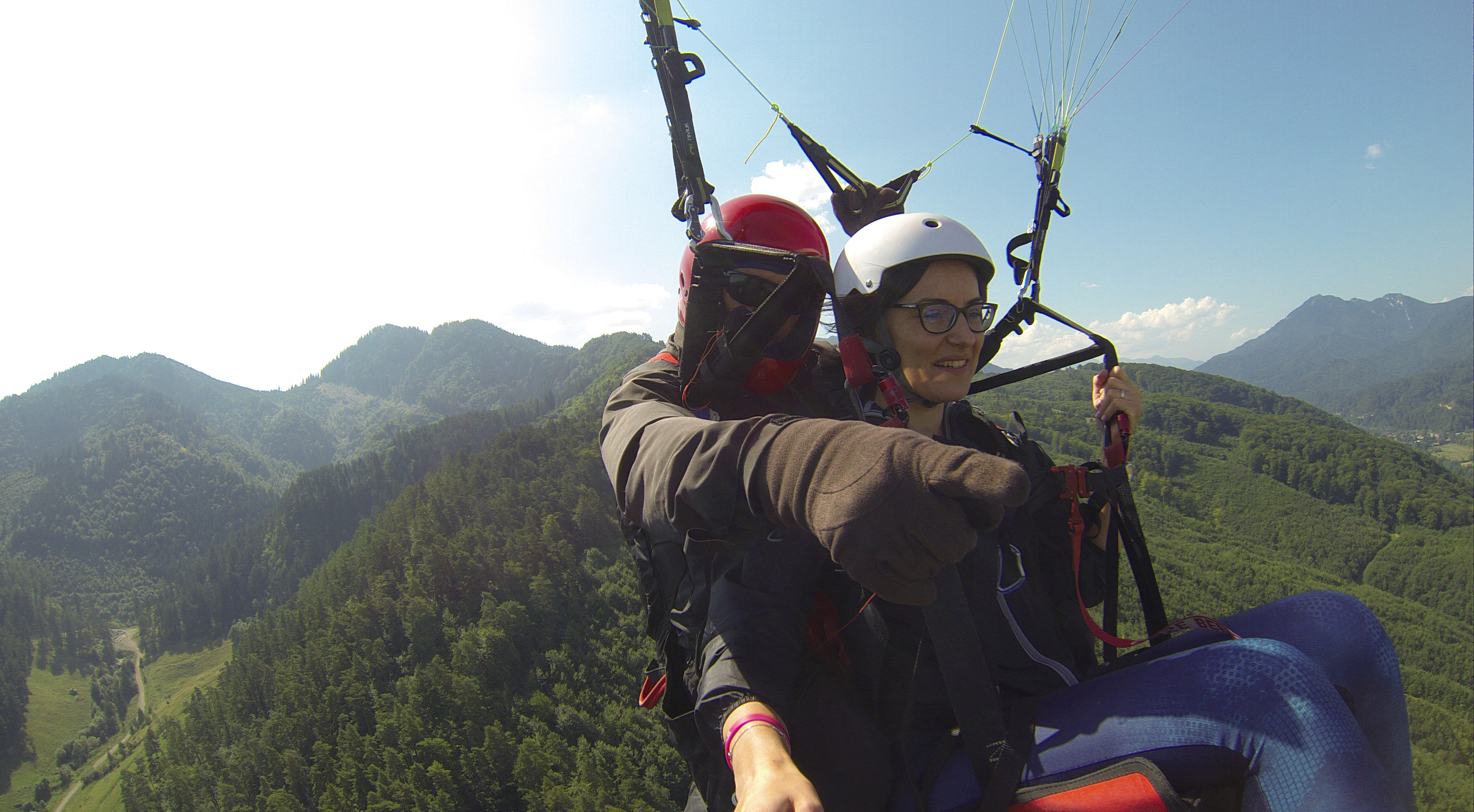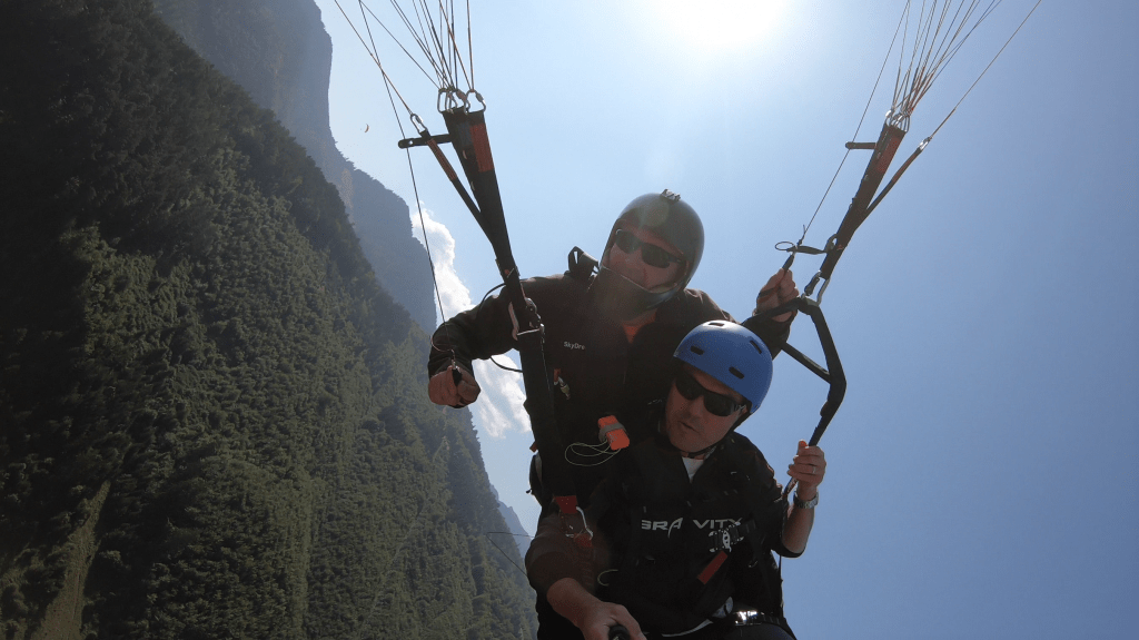 Dacă ai noroc, poate instructorul te va lasa să preiei comenziile parapantei, eu îi mulțumesc lui Fery pentru asta. Tu ca pasager, poți primi comenzile parapantei și efectua viraje ușoare în zbor. Vei fi tot timpul asistat de pilotul de parapantă.