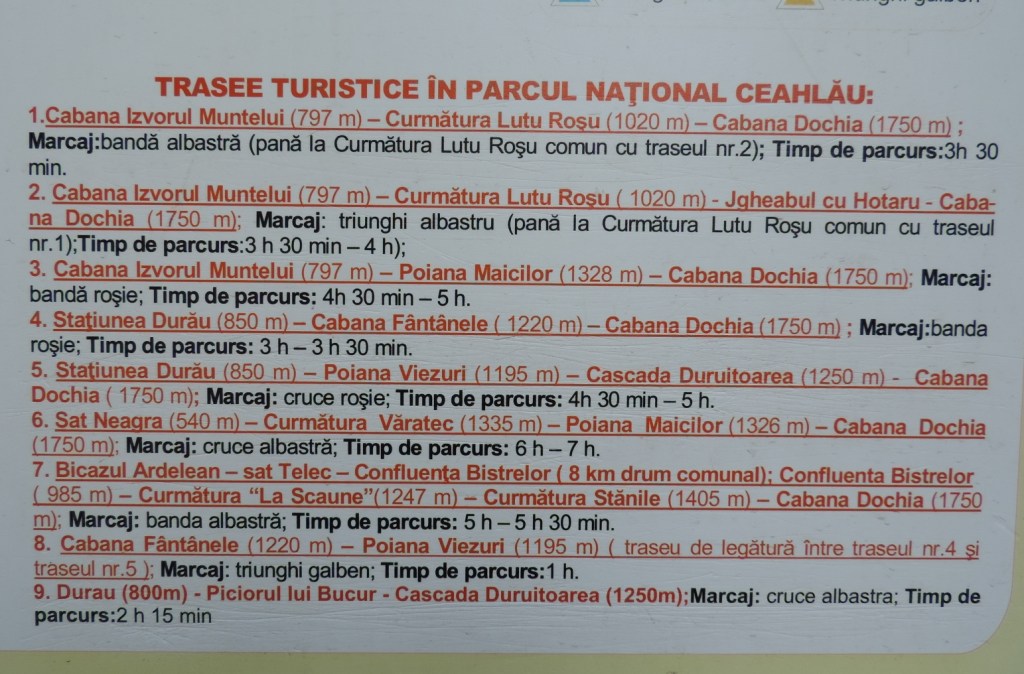 Sunt 8 trasee în total, pe diferite categorii de dificultate și distanță. Două dintre acestea pleacă din localitatea Durău. Dacă ai timp, poți studia harta cu traseele de lângă Centrul de informare turistică sau poți descărca aplicația Munții nostri.