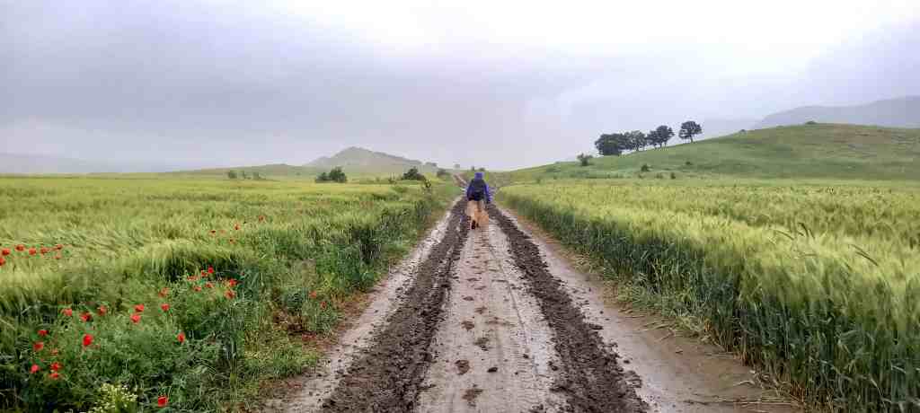 Jumătate de traseu ne-a plouat dar asta nu a fost deloc o problemă, padurea ne-a protejat puțin … dar când am ieșit în câmp deschis, noroiul ce s-a format ne-a împiedicat să grăbim pasul…. La un moment dat am făcut dreapta direct prin lanul de grâu, ca să ocolim câinii care se auzeau în zare de la stâne și oricum am fi ocolit mult, pe lângă Pietrele Mariei (vezi în stânga). Iar noi voiam să ajungem cât mai repede la mașină.