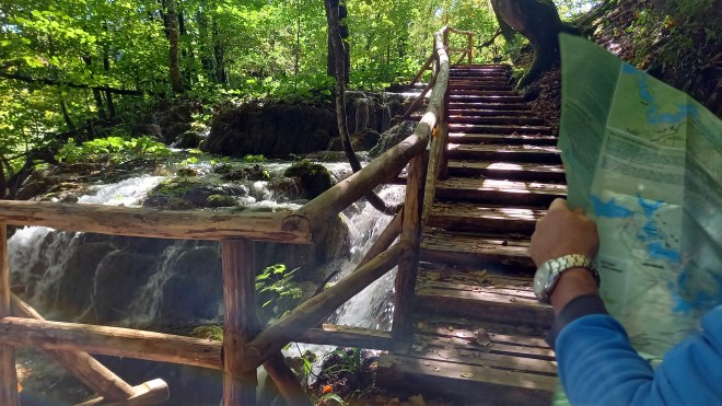 Am traversat repede lacul cu vaporașul (în 2 minute), apoi am urmat traseul. Am mers mult și bine, când pe malul apei, când deasupra ei, pe lângă cascade zgomotoase și răcoroase, pe cărări și podețe de lemn.