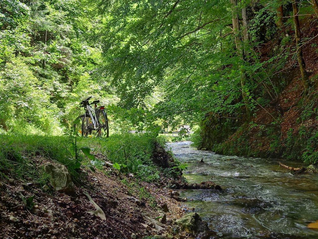 De la Ciocanu am lăsat în spate omulețul cu marcaj albastru pentru a urma o bucată de coborâre, pe șosea până la Dâmbovicioara. De aici am pedalat încă puțin până la Peștera şi cheile Dâmbovicioarei.