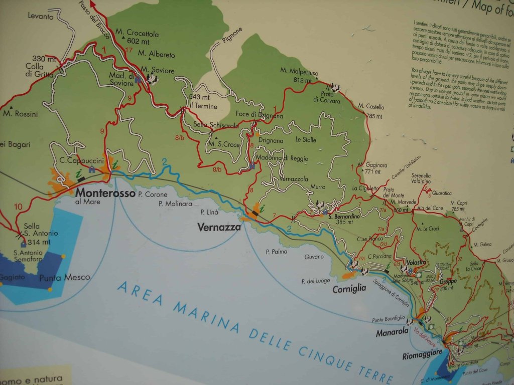 Între Vernazza și Monterosso al Mare este o potecă minunată, un drum de legătură cu izvoare, verdeață și care are puțin peste 3.5 km (2 h) iar dacă ai mai mult timp la dispoziție, poteca mai lungă este deschisă și ea (7.5 km). Printre viță de vie și măslini o superbă panoramă se deschide de sus, unde se văd cele 2 stațiuni.