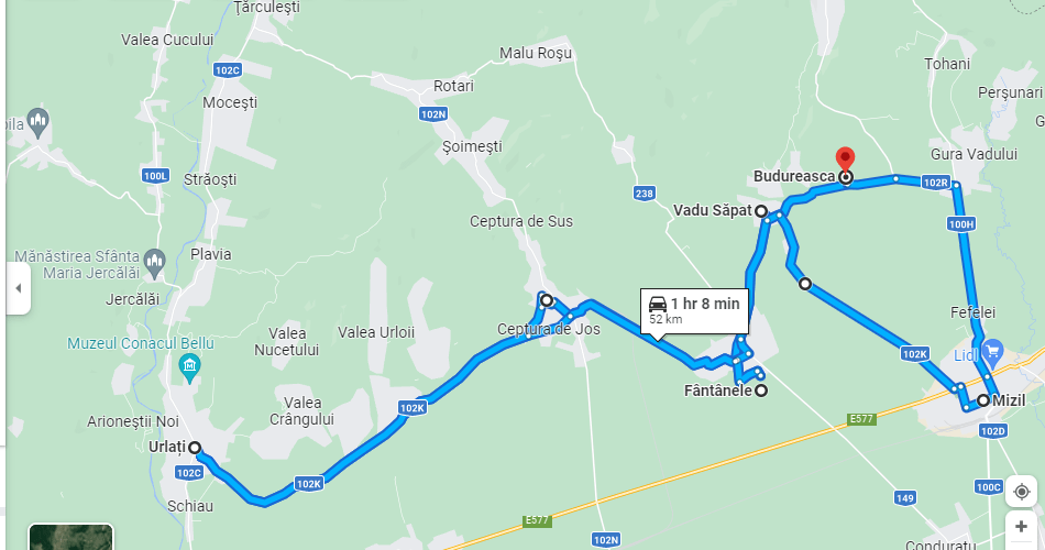 A doua zi a fost mai interesant pentru ca am reusit sa pedalam 50 de km pe sosea si macadam. Traseul ales este într-o zonă deluroasă cu variațiuni de urcare – coborâre printre dealuri frumos colorate de rapiță și viță de vie. Traseul străbătut de noi pe biciclete trece prin zone fără trafic intens, mai ales în cursul săptămânii, exceptie fiind drumul de la Mizil înapoi spre Budureasca, pe DJ 100H.