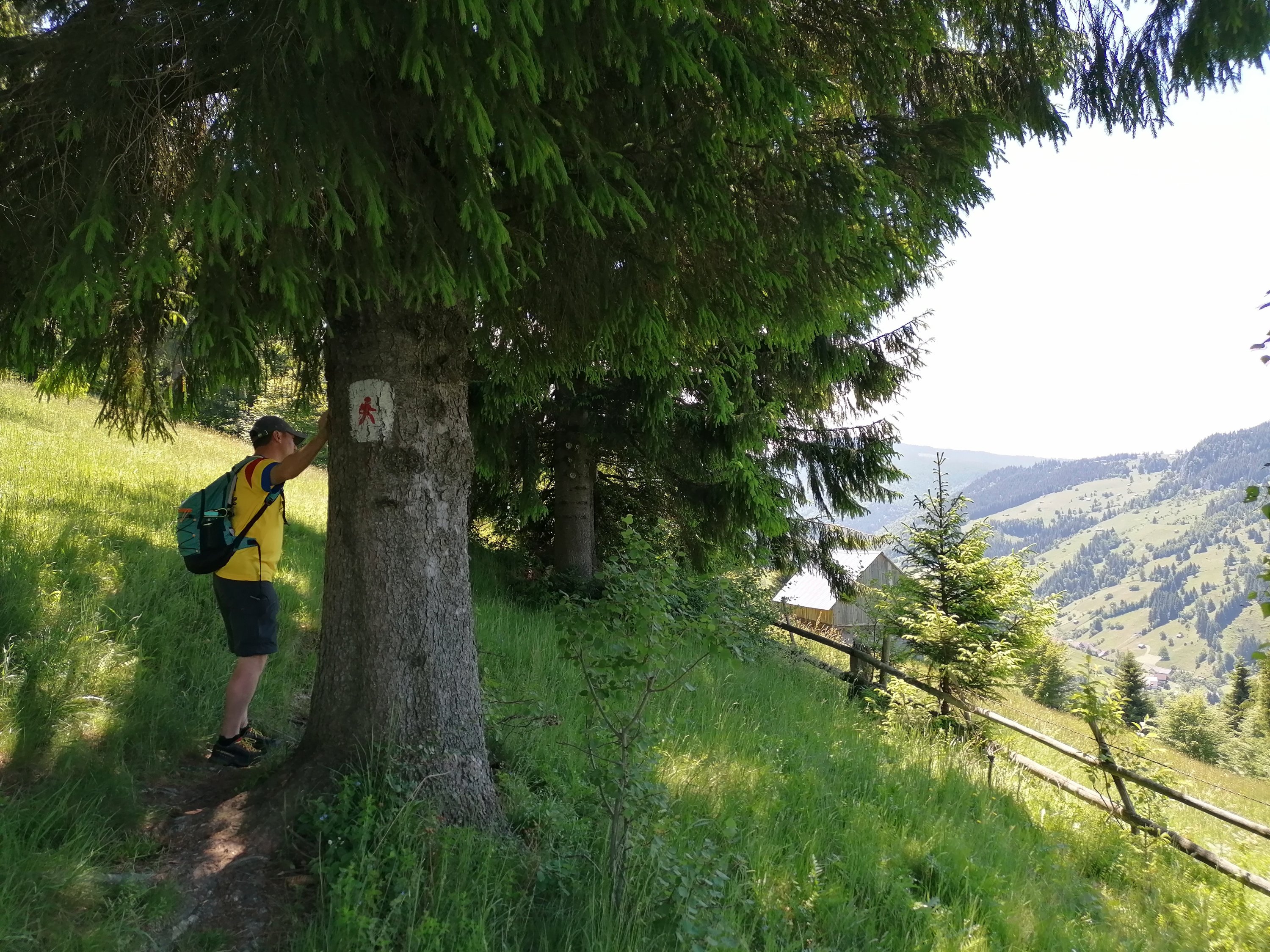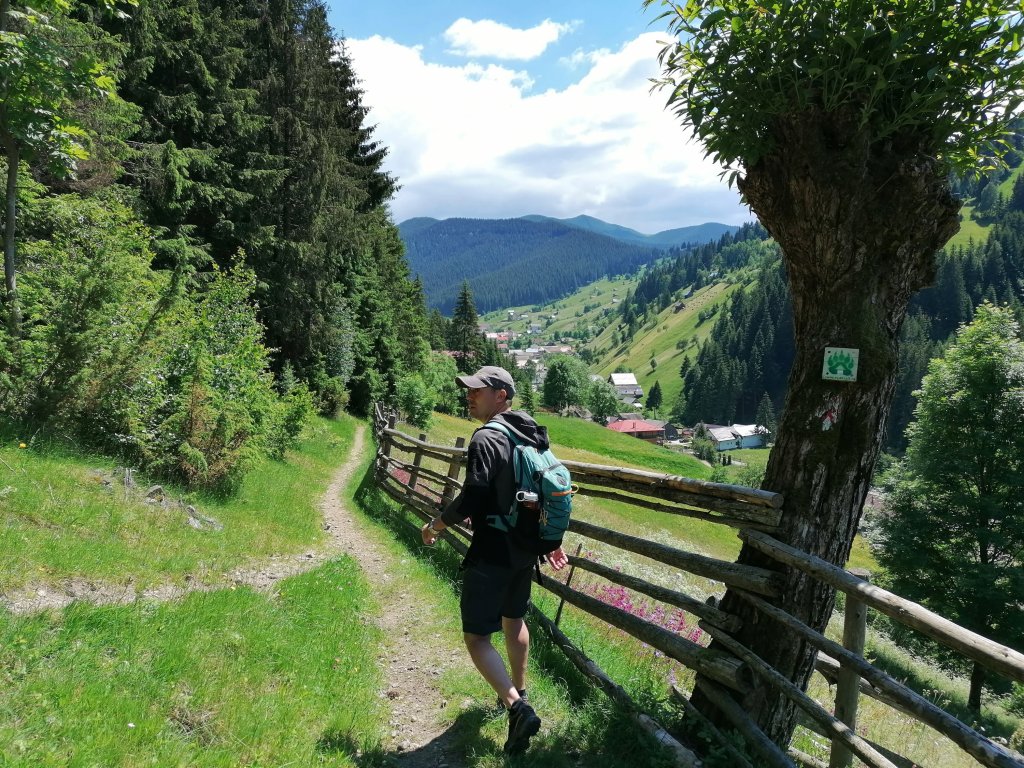 Am reușit să ocolim terenul propietarului nemulțumit pentru că așa trebuia ☺️😉 dar și pentru că am ratat semnul cu omulețul roșu, cred că undeva printre grădini când, la un moment dat era o cadă pentru colectarea apei și acolo noi ar fi trebuit să facem dreapta… Am făcut stânga pentru că am văzut marcajul cu verde în schimb și oricum eram aproape de șosea, nu avea unde să ducă altundeva.