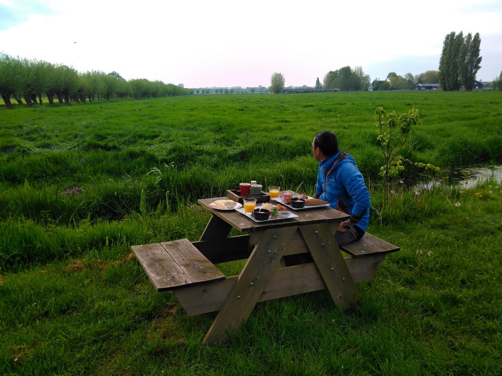 Abia ce ieșisem din Amsterdam că o greșeală mică ne-a costat timp pierdut și frustrare. De data asta nu am reușit să rezolvăm singuri problema și am căutat ajutor… Pana de la bicicleta mea ne-a încetinit mult acea zi! Am avut noroc că în sătucul Abcoude era un service de biciclete la 10 min. de mers de unde avusese loc accidentul. Aici am găsit oameni faini care ne-au înțeles până la urmă frustrarea și ne-au reparat-o fără rezervare, într-o oră (pană și ghidonul strâmbat).