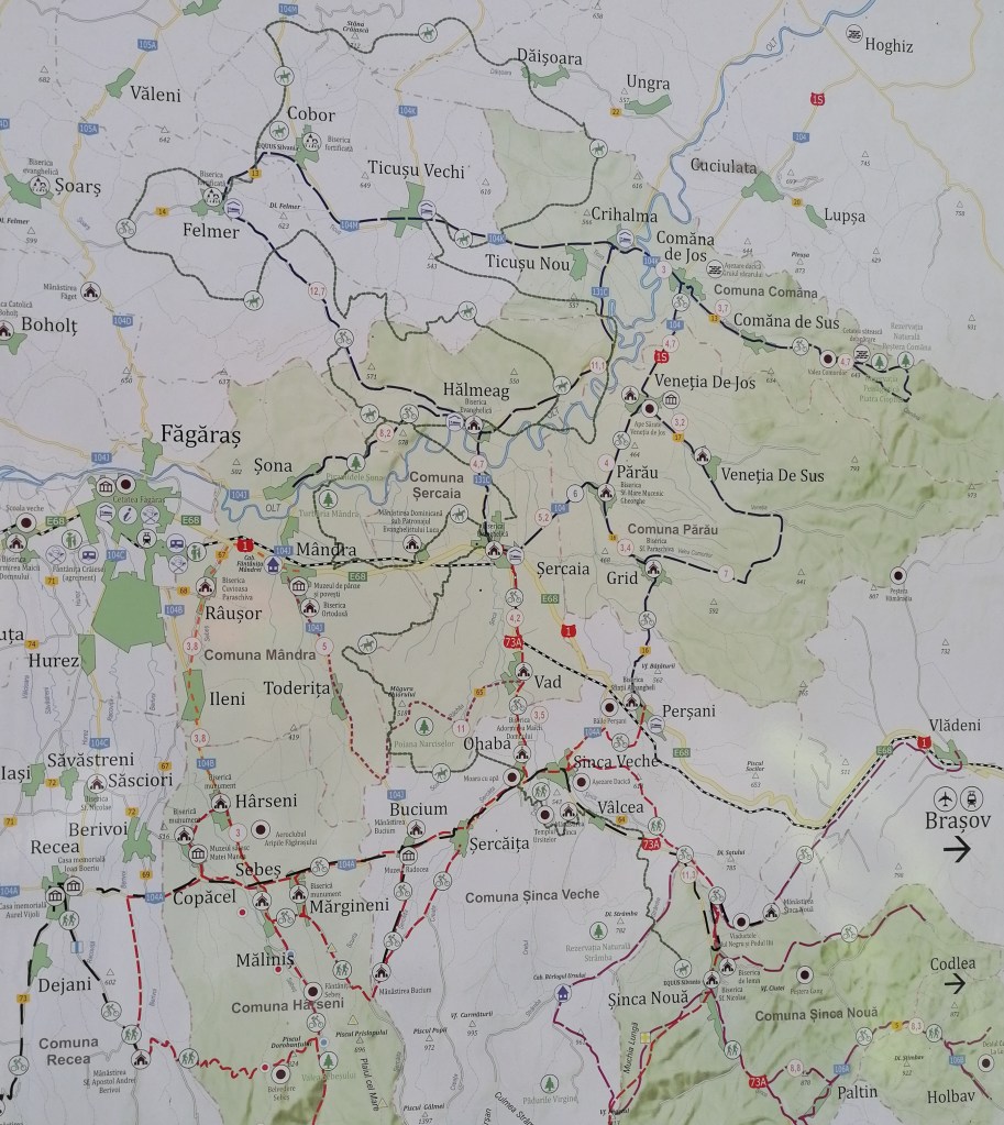 Dupa cum poti observa, pe harta sunt mai multe trasee pentru cicloturism. Daca ajungi in zona, vei observa si marcajul C cu albastru pe stalpi sau pe copaci. În total sunt 170 km de cicloturism la poalele Făgăraşului.